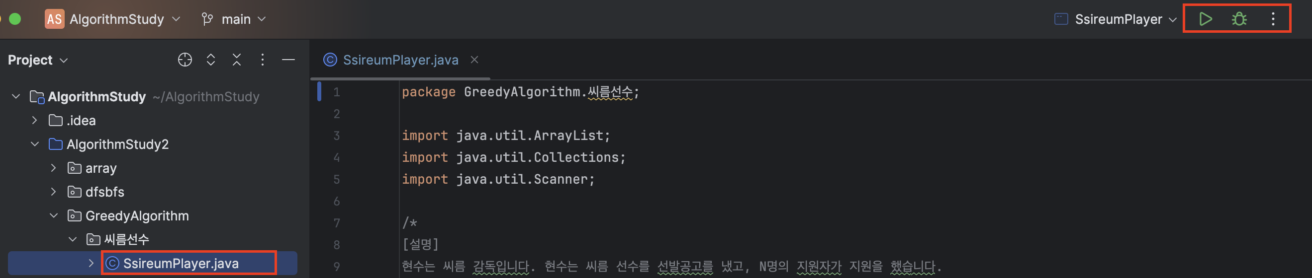 아래와 같이 main 메서드가 있음에도 불구하고 java 파일이 컵 모양으로 바뀌어져 있고 오른쪽 상단에서 실행 버튼도 활성화 되지 않는것을 볼 수 있다.