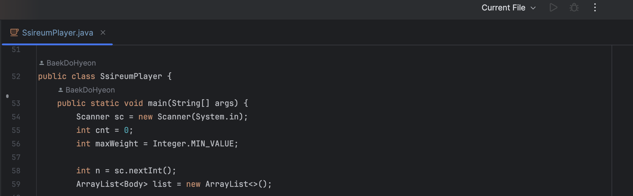 누르면 아래 사진과 같이 .java 파일이 컵 모양에서 C 모양으로 바뀌게 되었고, 오른쪽 상단에 실행 창도 활성화 된것을 볼 수 있습니다.