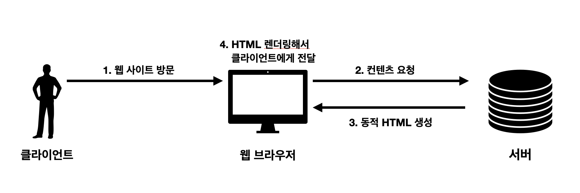 - 이에 서버는 페이지에 필요한 데이터를 즉시 얻어와 모두 삽입하고, CSS까지 모두 적용해 렌더링 준비를 마친 HTML과 JavaScript 코드를 브라우저에 응답으로 전달합니다.