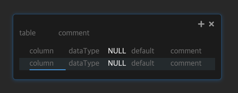 그럼 아래와 같이 column 을 설정할 수 있는 칸이 추가가 된 후, 컬럼명과 컬럼의 데이터 타입, NULL 유무, default 값 설정 및 comment 를 설정할 수 있다.