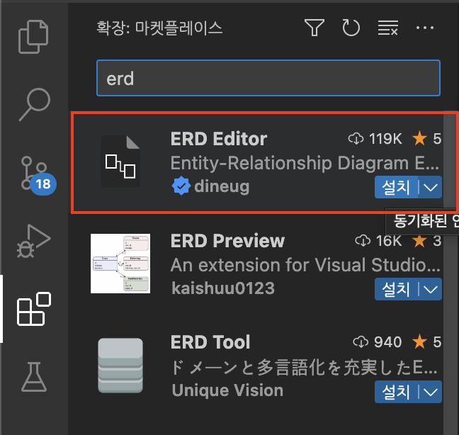 우선, vscode 의 "확장" 탭에 들어가 "ERD Editor" 를 설치해준다.