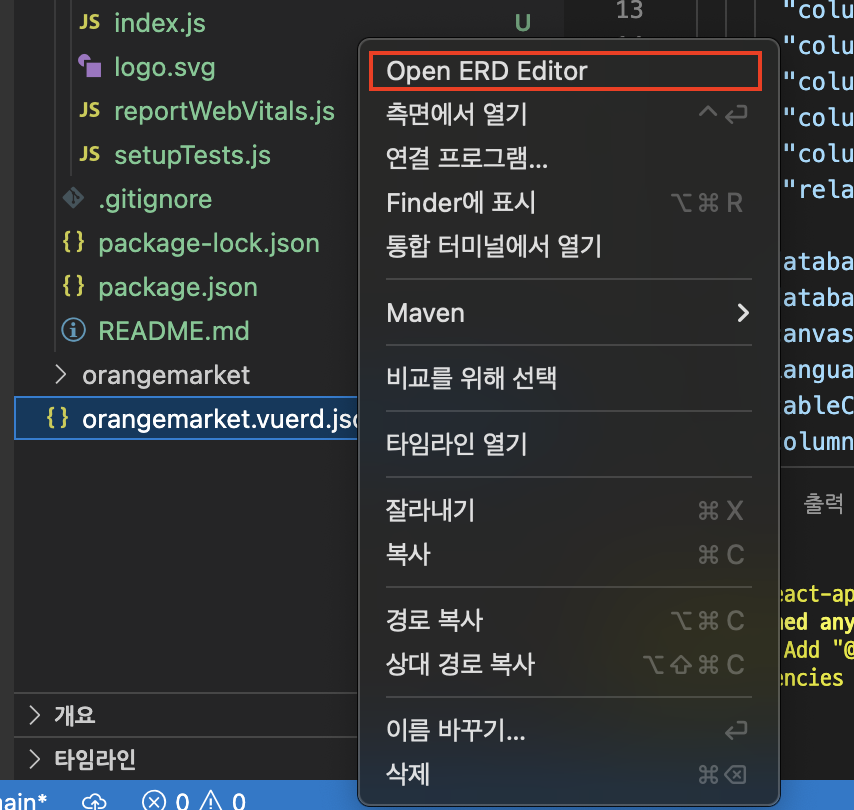만들어진 파일을 우클릭을 한 다음 "Open ERD Editor" 를 클릭하여 ERD 편집기를 켜줍니다.