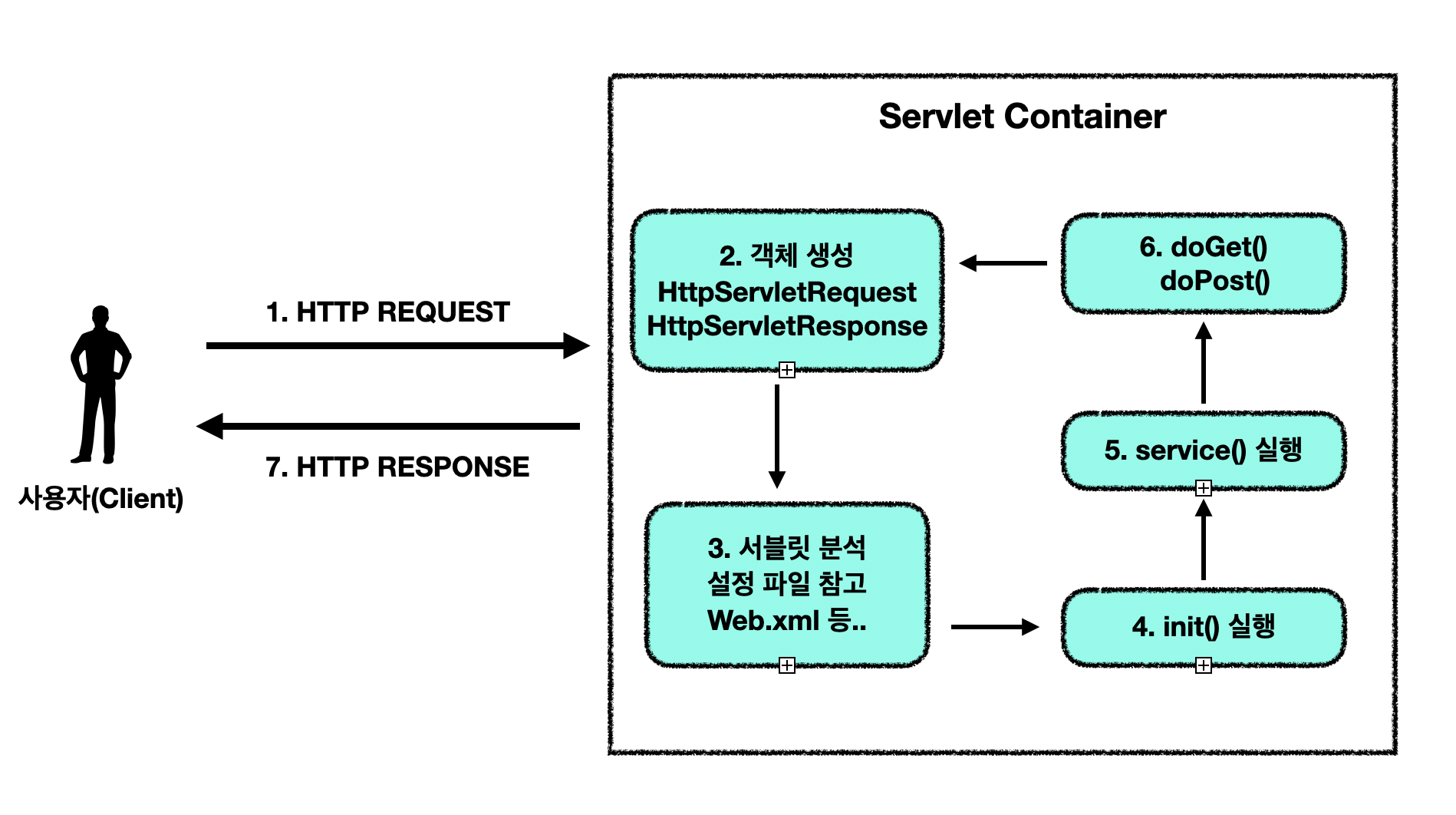 6. doGet(), doPost() 메서드는 동적 페이지를 생성한 후, HttpServletResponse 객체에 응답을 보냅니다.