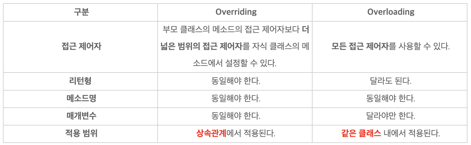 오버라이딩은 오버로딩과는 다르게 부모 클래스의 메서드를 재정의하는 것이므로, 자식 클래스에서는 오버라이딩하고자 하는 메서드의 이름, 매개변수, 리턴 값이 모두 같아야 한다.