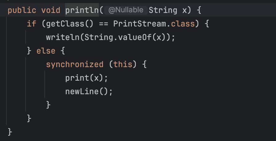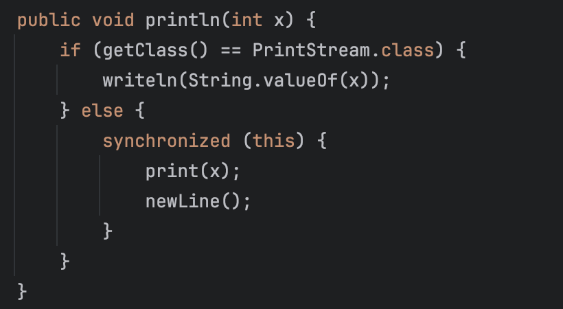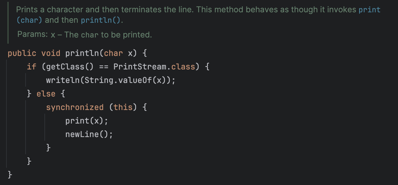 실제로 System.out.println() 에서 사용하는 println 메서드가 정의된 것을 확인해보면 아래 사진처럼 이미 구현되어 있는 것을 확인할 수 있다. (java.io.PrintStream에서 확인 가능하다.)
