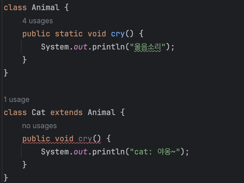 부모에도 cry 메서드가 있지만 자식 클래스에서 재정의함으로써 부모 메서드가 아닌 자식 클래스의 메서드가 호출된다.