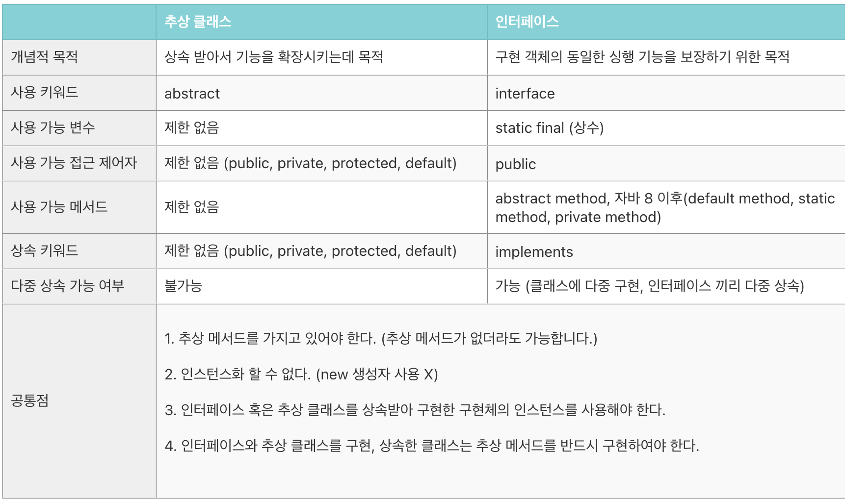 마지막으로 추상 클래스와 인터페이스를 간단하게 정리한 표로 마무리 하겠습니다.