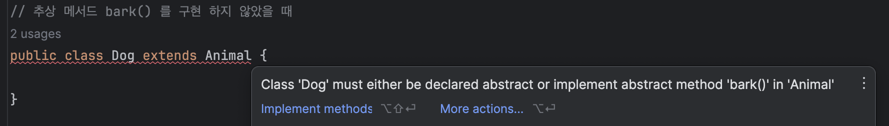 자식클래스에서 상속은 받았지만 오버라이딩을 하지 않을 경우 에러가 발생합니다.
