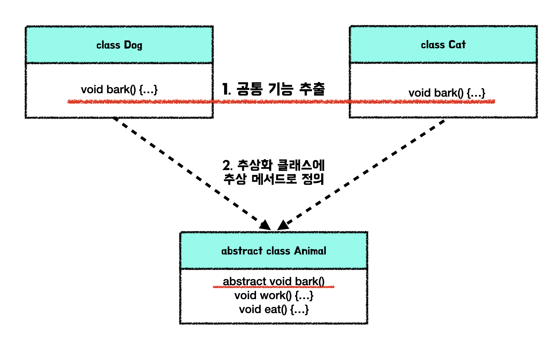 그렇기 때문에 work(), eat() 은 부모 클래스에서 구현해주고 서로 다른 bark() 메서드만 추상 메서드로 선언한것이죠.