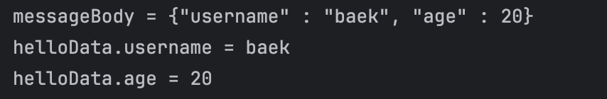 아래 사진을 확인해 보면, 정상적으로 JSON 형식의 데이터가 우리가 만들어놓은 HelloData 객체에 파싱 되어 잘 출력되는 것을 확인할 수 있습니다.