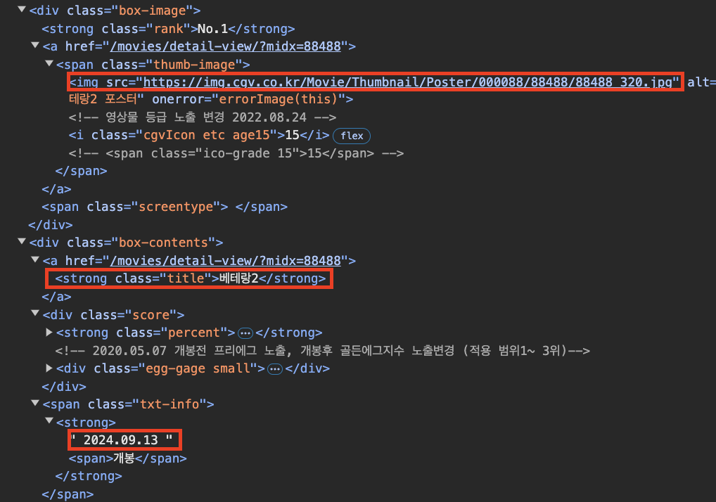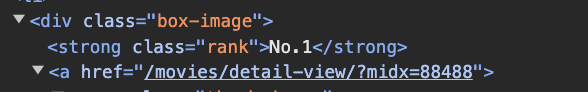 이곳에서 우리가 얻을 수 있는 값은 box-contents 라는 div 태그 안에 title 이라는 class에 영화제목이 담겨있다는 것.
