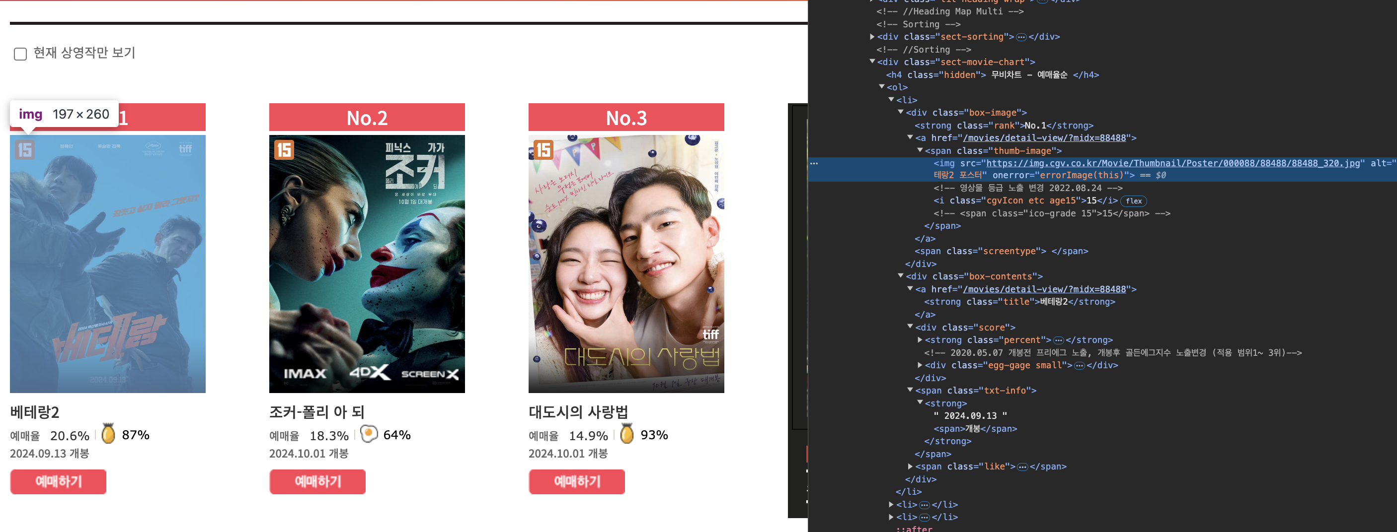 크롤링 타겟 주소 : http://www.cgv.co.kr/movies/?lt=1&ft=0