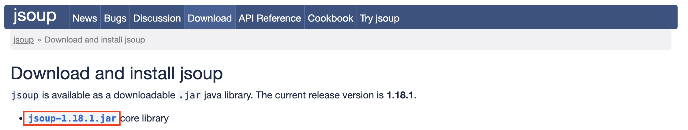 Download and install jsoup jsoup is available as a downloadable .jar java library. The current release version is 1.18.1. What's new See the 1.18.1 release announcement for the latest changes, or the changelog for the full history. Previous releases of jso