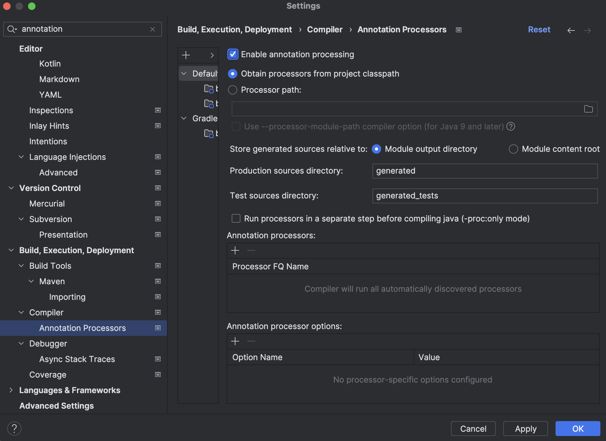 Setting -> annotation processors 검색 후, 맨 위에 Enable annotation processing 활성화 후 적용
