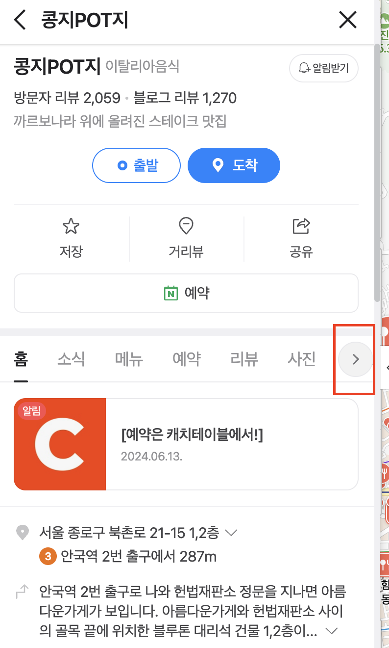 "홈", "소식" , "메뉴", "예약", "리뷰", "사진", "정보" 등등..