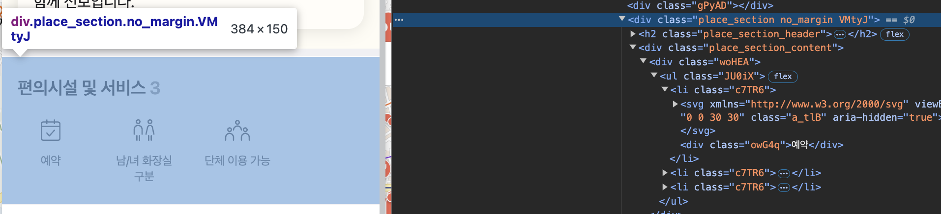 굳이 왜 이렇게 코드를 작성했냐면, 일단 간혹가다 매장의 "편의시설 및 서비스" 부분이 존재하지 않을 수도 있습니다.