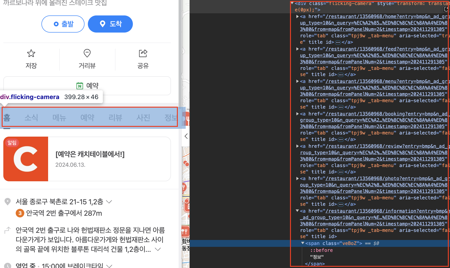 "홈", "소식" , "메뉴", "예약", "리뷰", "사진", "정보" 등등..