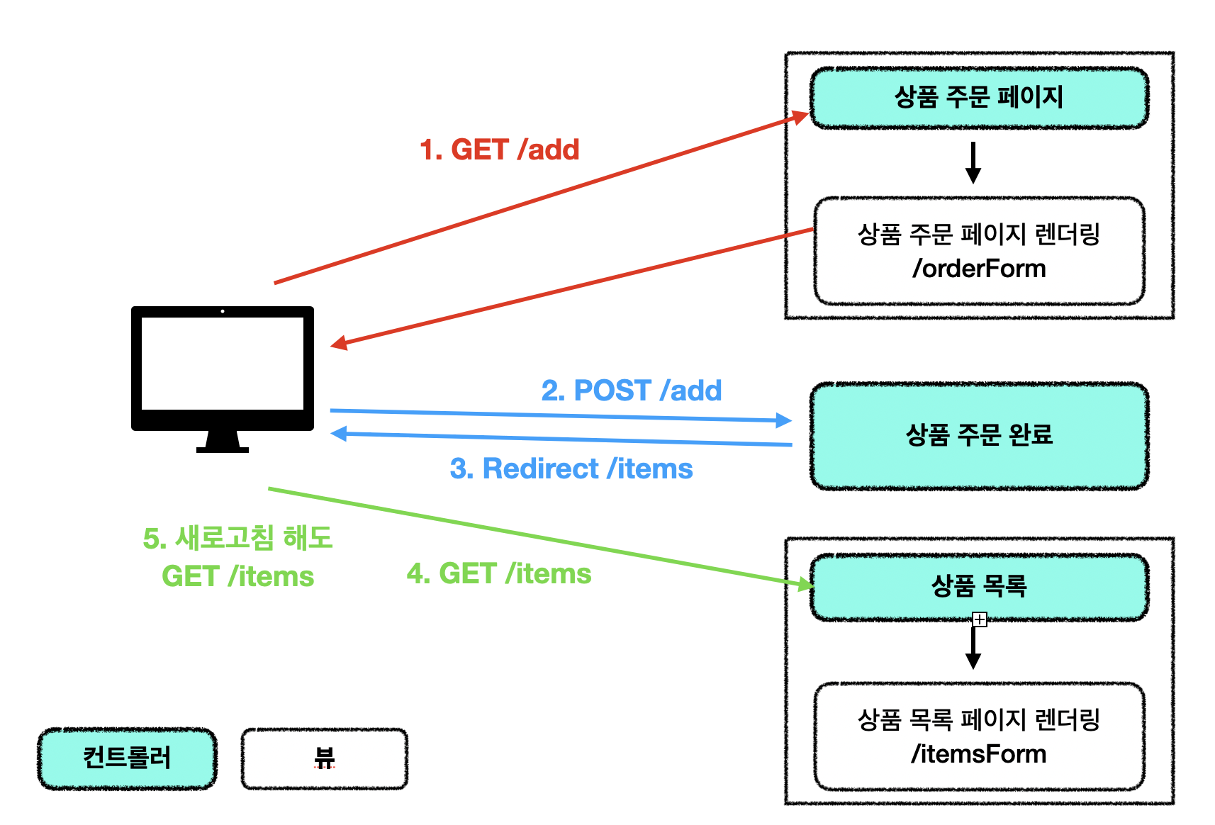 보통 HTTP 메서드 중 GET은 읽어오는(조회), POST는 저장하는(수정, 삭제 등등) 역할을 하지만, 이 예제에서는 GET은 조회, POST는 저장이라고 하면 새로고침할 때마다 계속 상품 주문(저장)을 하게 된다는 것입니다.