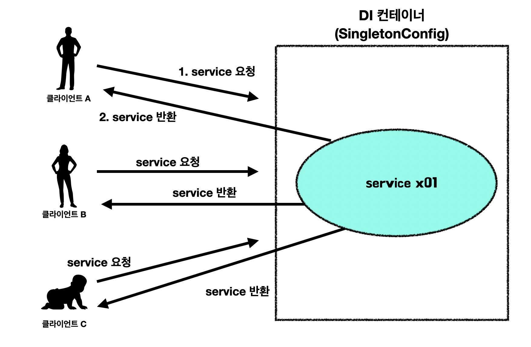 그렇기 때문에 동일한 요청(service)에 클래스의 인스턴스를 딱 1개만 생성하여 관리하도록 합니다.
