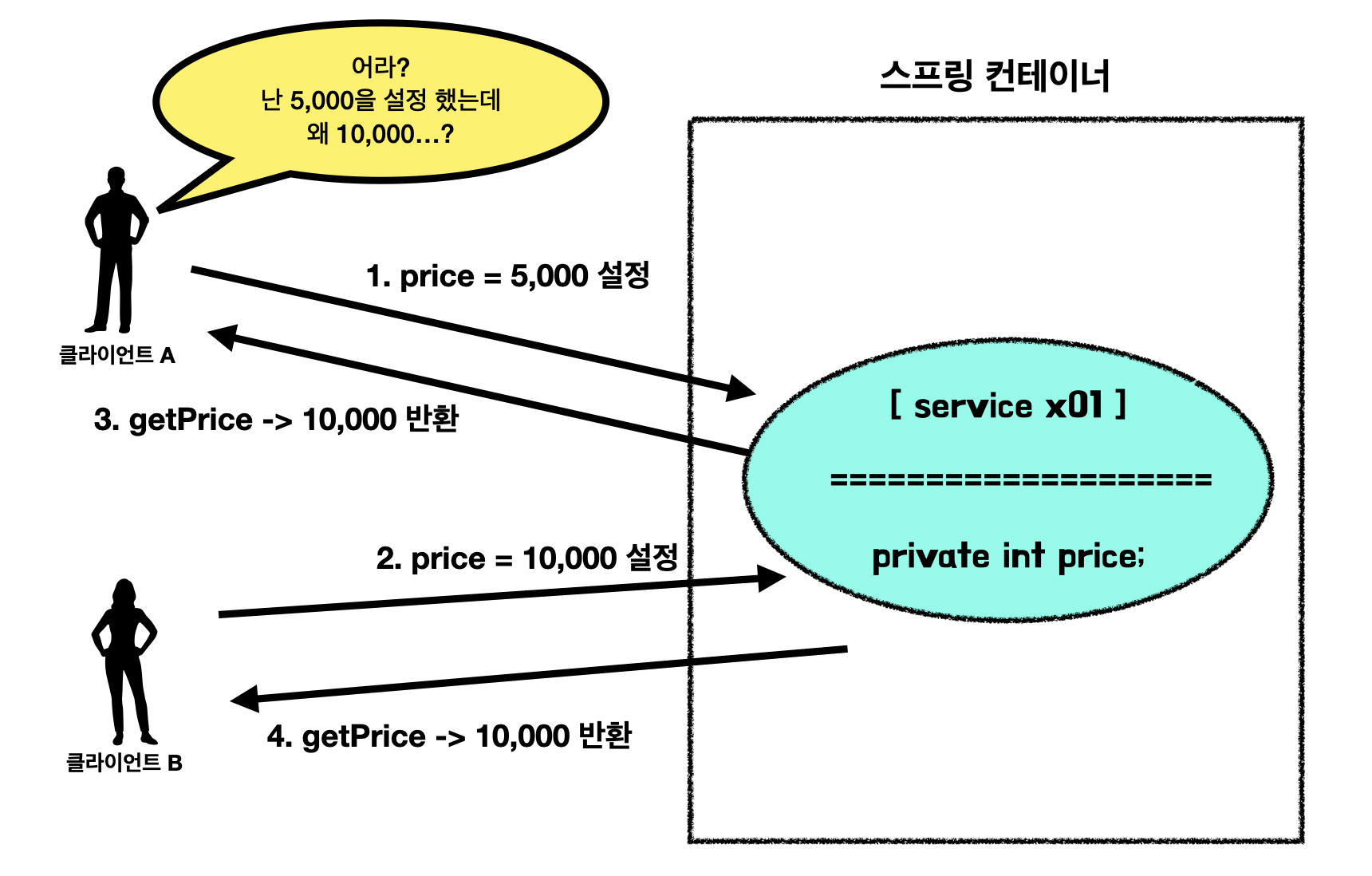 아래 그림과 같이 클라이언트 A가 service에 price 값을 5000으로 설정했다고 가정해 봅시다.