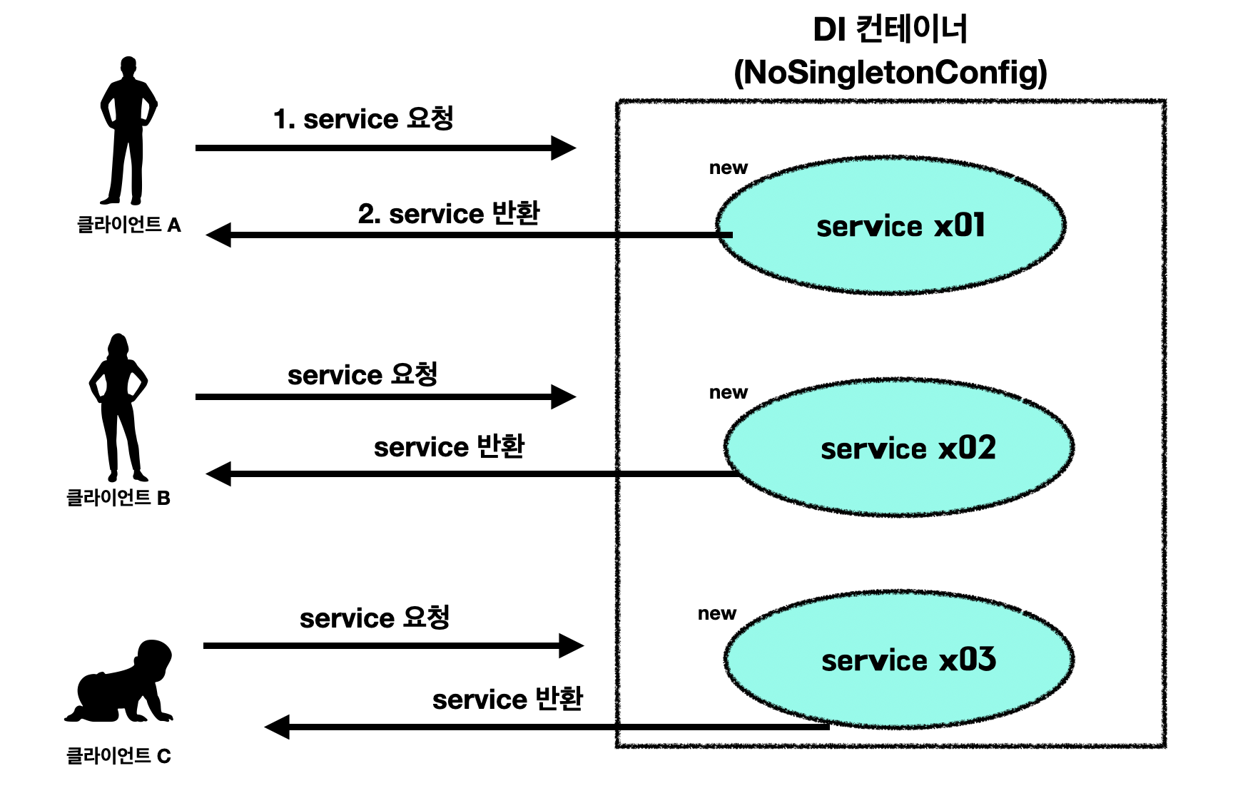 위의 코드는 아래 사진과 같이 클라이언트가 서비스를 호출할 때마다 매번 새로운 객체를 생성하여 클라이언트에게 반환을 해줍니다.
