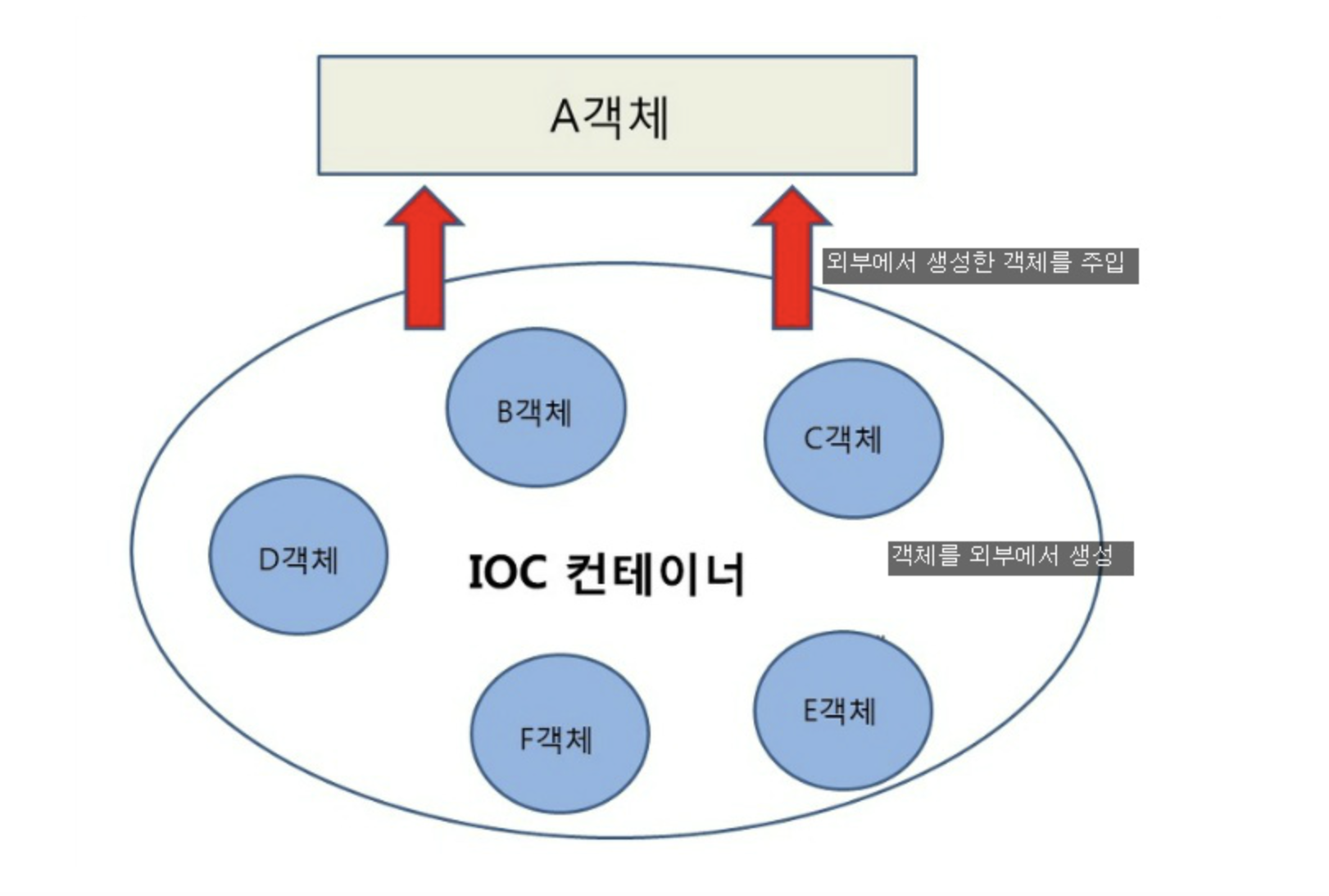 스프링에서는 위 사진과 같이 외부의 대상이 IoC 컨테이너가 되어, 빈(객체)을 알아서 주입해 줍니다.